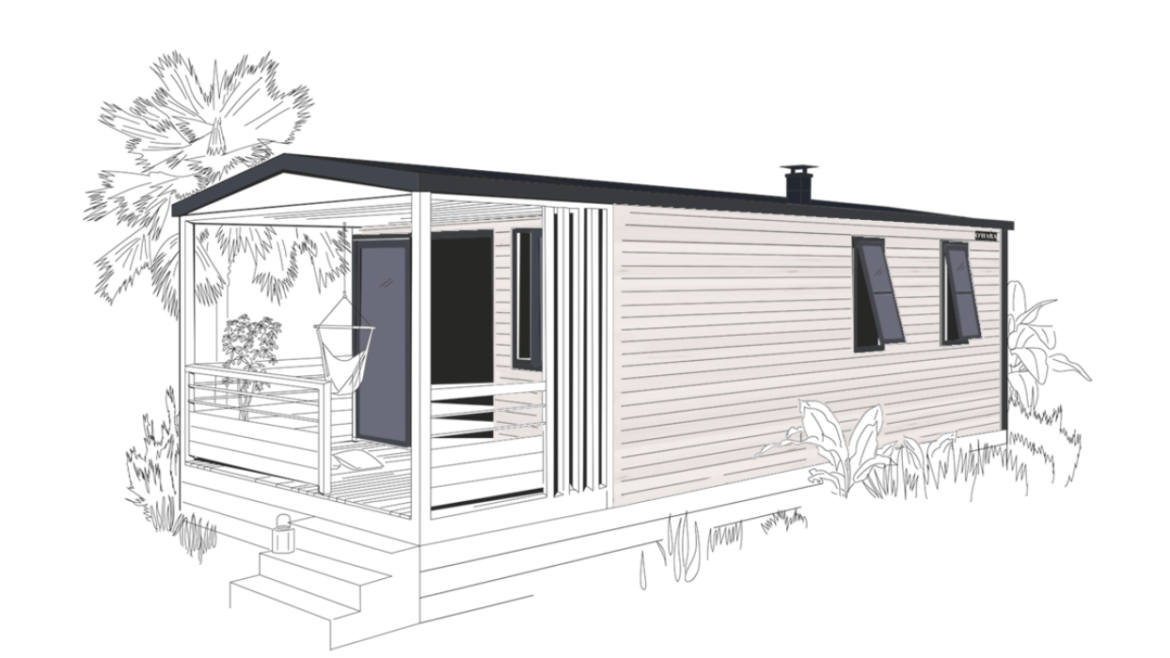 Grand mobil home 9m x 4m, avec grande terrasse entièrement bachée, cuisine suréquipée.